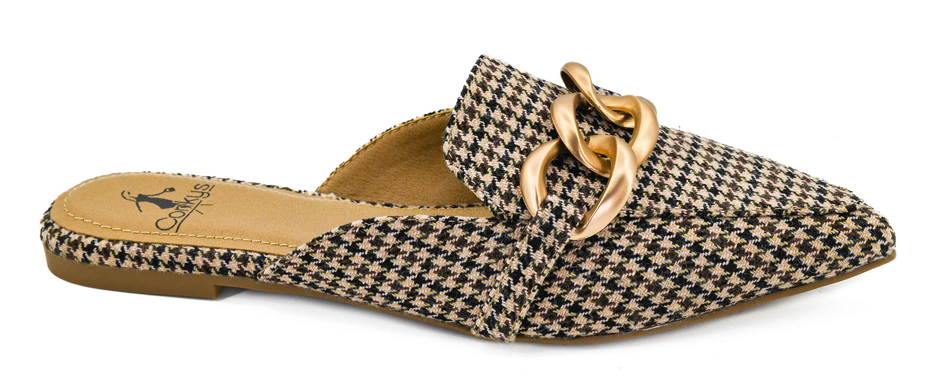 This Corkys Playin For Keeps Mule is designed with a black and tan houndstooth pattern, providing a stylish and classic look. With its durable and comfortable design, you'll be able to step out in style while keeping your feet feeling great. Upgrade your shoe collection with these versatile and fashionable mules.