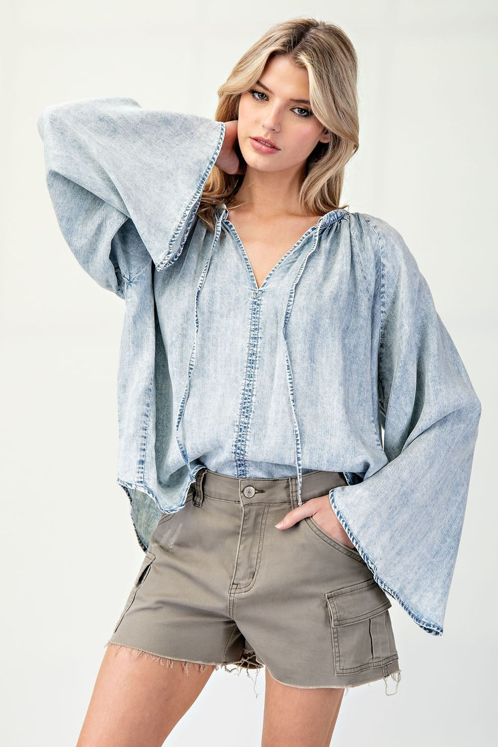 Product Detail: Mineral washed long sleeve blouse top featuring a V-neckline with a front tie drawstring, bell sleeves, pinching in the back for added detail and is a flowy fabrication.