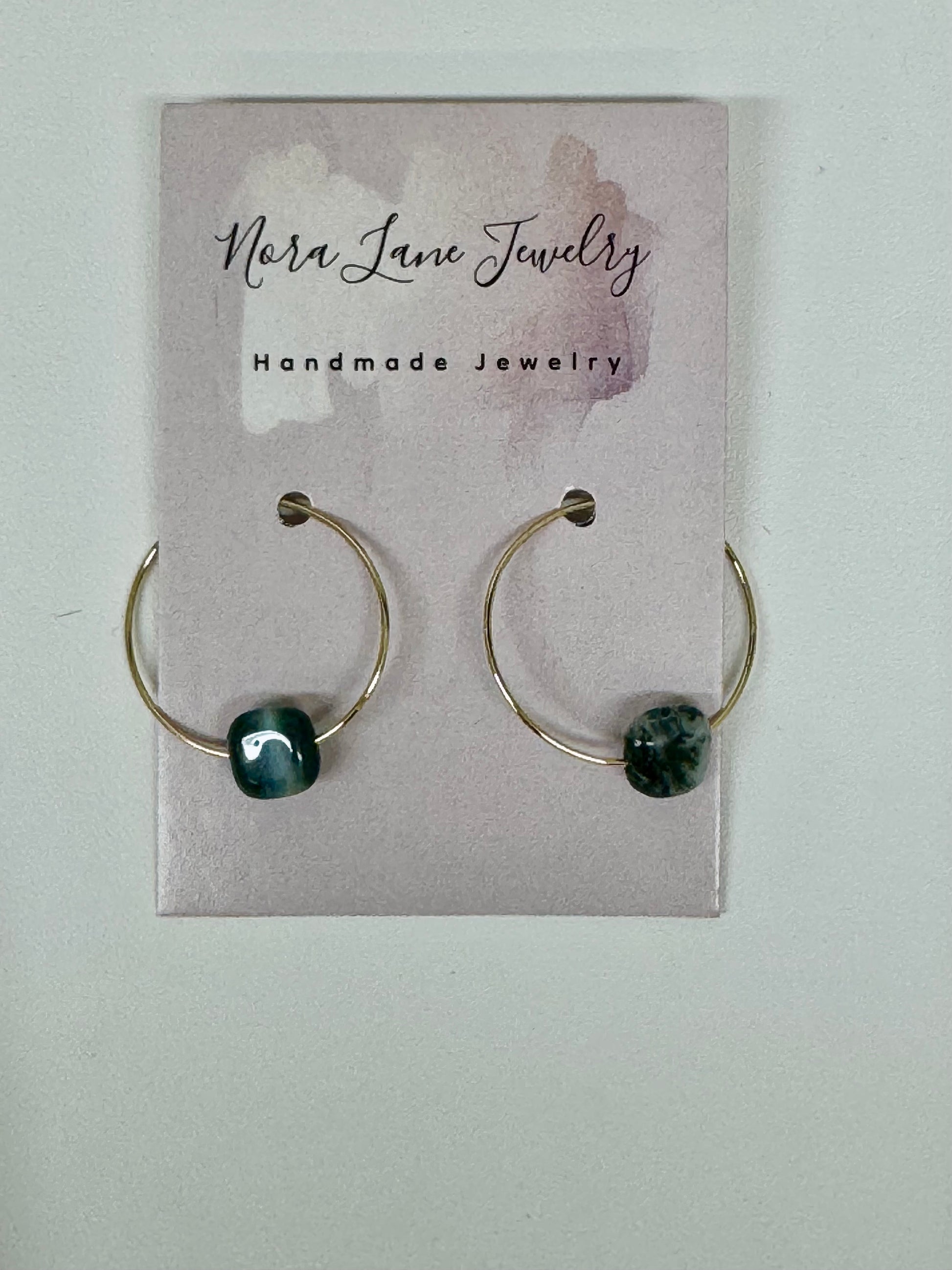 Ground your style and natural beauty with these handcrafted gold hoop earrings accented by rich, green blue stone beads. The swirling tones of forest and moss bring an earthy elegance to a clean minimal design-making them versatile enough every day where are dressing up a simpl outfit.