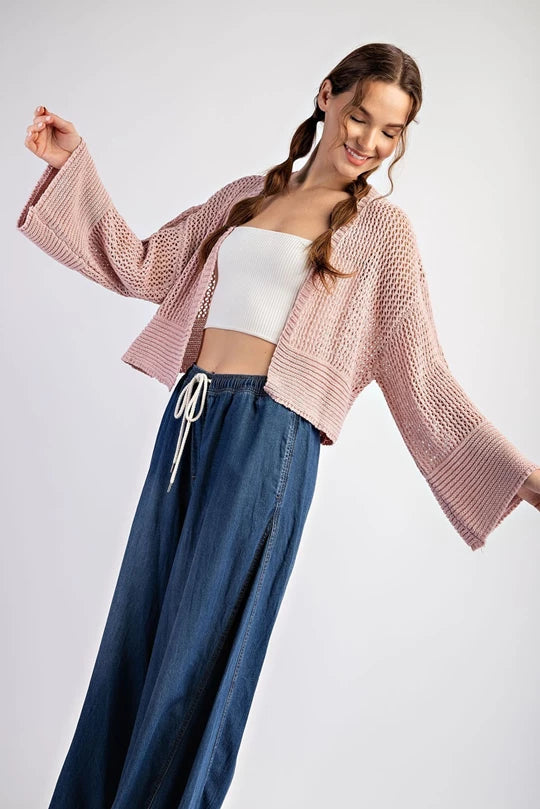 Long sleeve cardigan featuring a cropped length and an all over eyelet knit