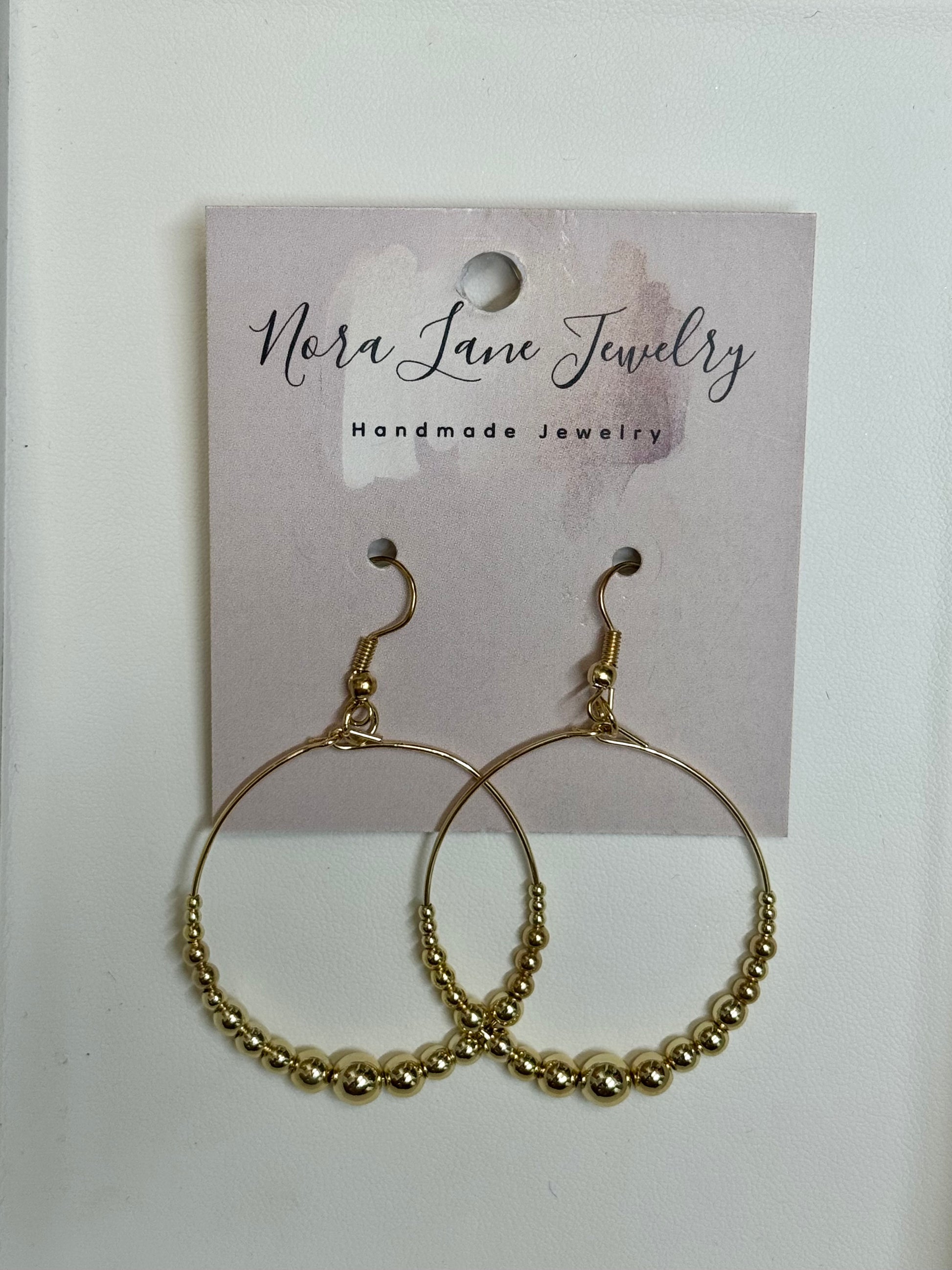 Radiant golden beads in perfect symmentry along delicate wire hoops, creating a luminous design that's both timeless and refined.