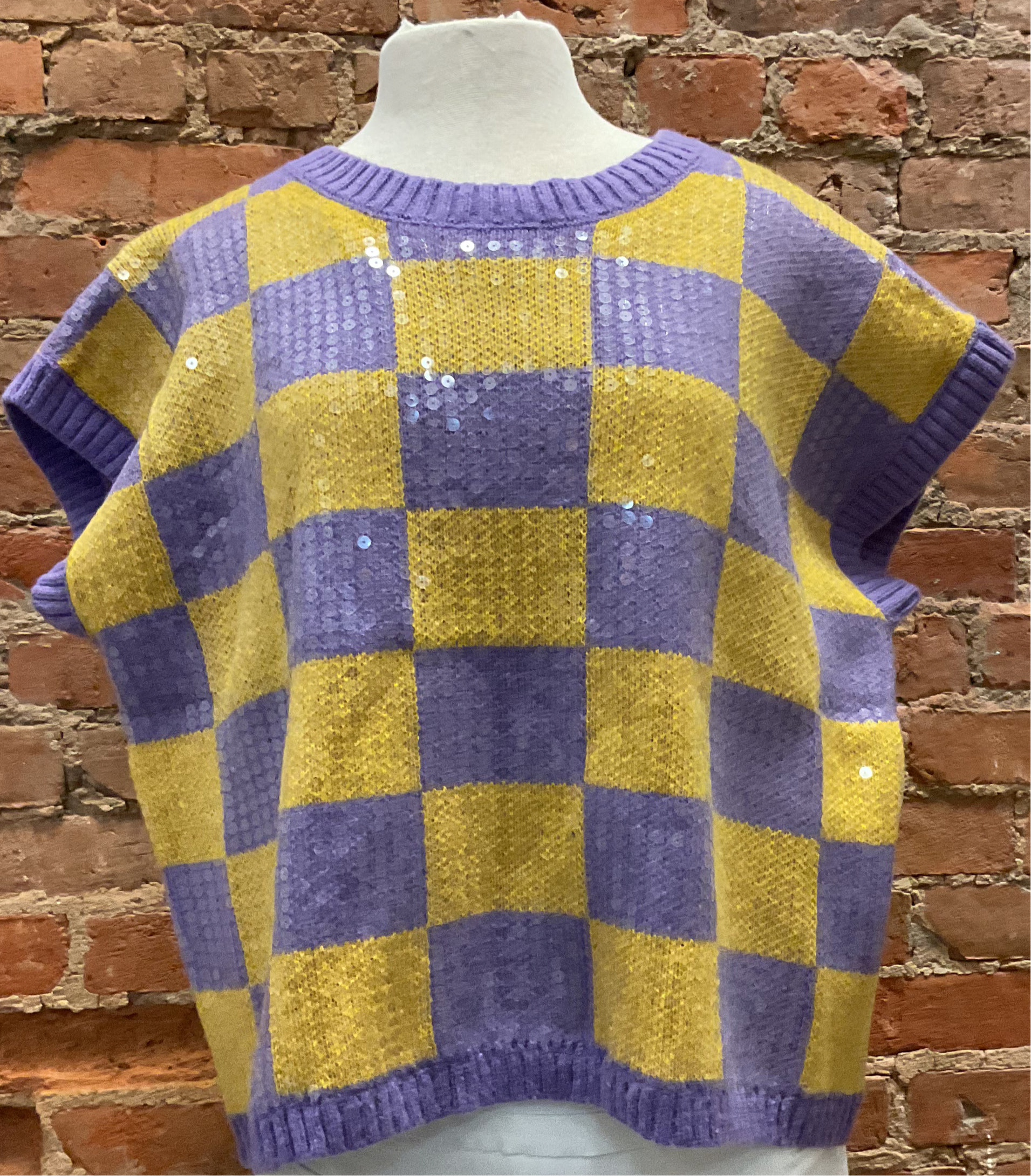 Introducing the Tiger Tailgate Sweater. Made with a purple and gold checkerboard pattern, this sweater is perfect for showing your team spirit. Stay warm and stylish on game day with this must-have piece.